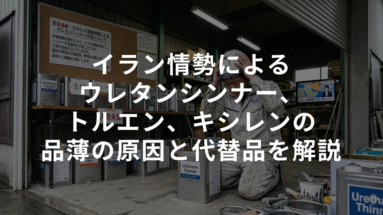 米国とイスラエルによる2026年2月28日のイラン攻撃から、イラン情勢は急速に悪化し、日本が使う原油の大半が通過するホルムズ海峡が事実上封鎖されました。この影響で、製造大手の日本ペイントは、シンナー類全般を対象に、3月19日発注分から75%の値上げを実施した他、市中の店舗ではウレタンシンナーをはじめ、ウレタン塗料の希釈や洗浄に用いるトルエンやキシレンなどが品薄で入手困難になっています。この記事では、品薄の背景と代替品であるNTXウレタンシンナーを解説します。