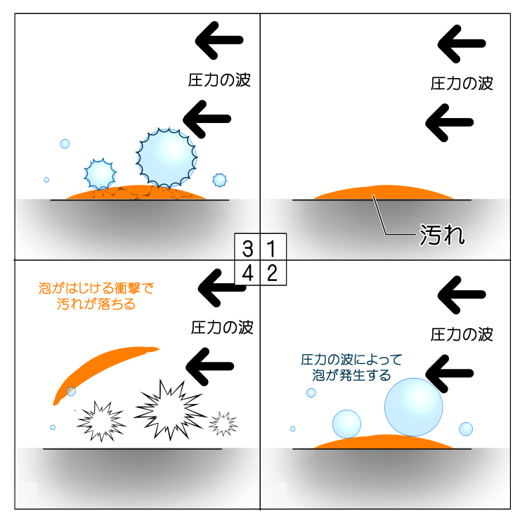 キャビテーションによる洗浄は油汚れに効果的であると言われ、下の図のように汚れをおとしていきます。